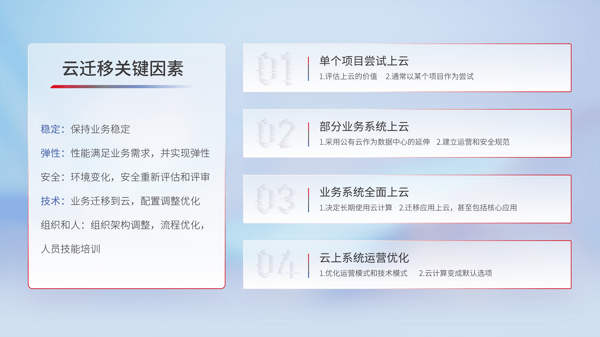 结合实际业务,,从规划设计、、、云平台选型、、、、云原生改造、、、、数据迁移、、集成交付,,迁移全过程为客户识别最佳上云路径,,做好风险识别管理,,设计网络架构、、、、身份权限、、安全审计合规、、操作审计、、、日志审计、、监控告警策略、、、多站点容灾设计等,,对云上基础设施进行整体规划,,提升IT治理水平,,,,以满足弹性、、高可用、、、、高性能的需求。。