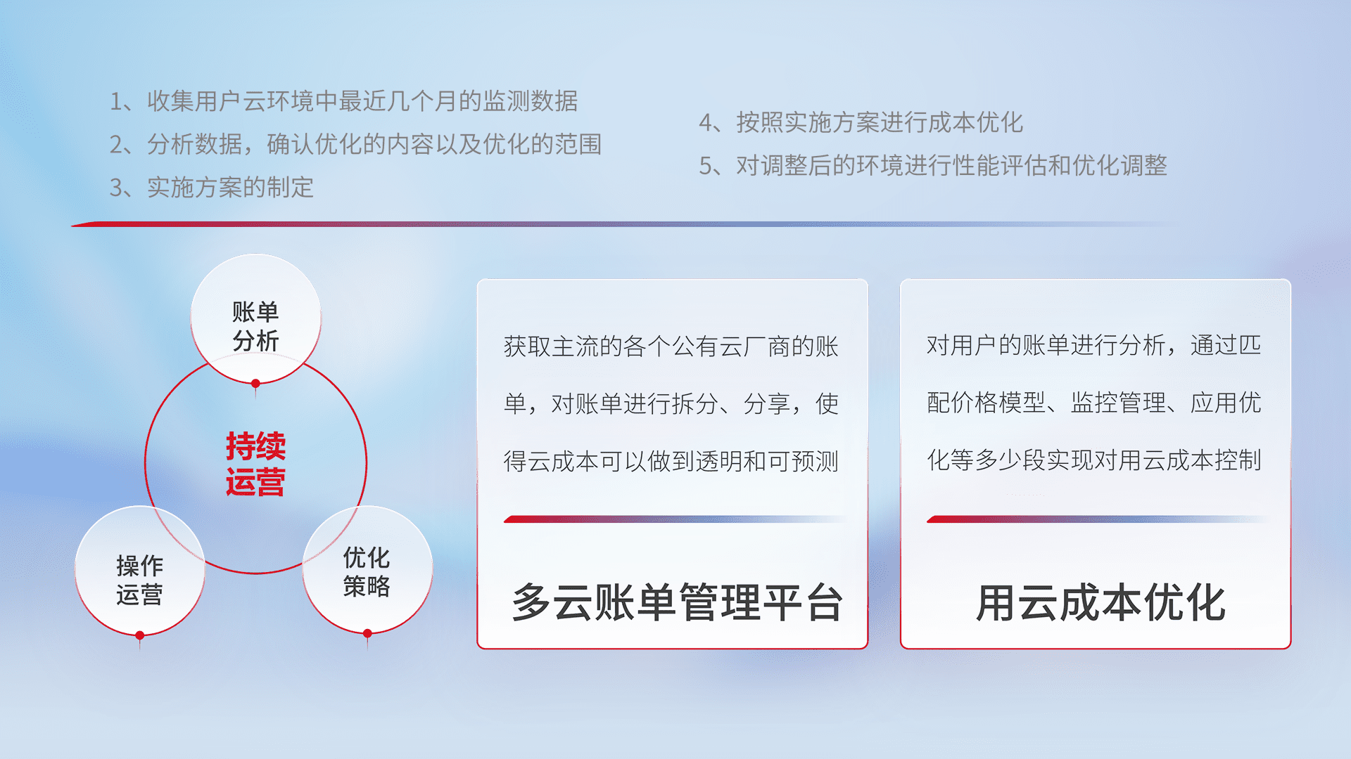 通过多云纳管,,以统一的资源数据模型把客户的云资源进行抽象和封装,,进而实现对多云资源的统一操作,,,,保障云资源管理的可靠性、、稳定性与可用性。。。量身定制化运维内容,,,,配置、、、开发运维、、、补丁管理、、、备份、、、、监控、、、认证和访问管理、、、审计和日常巡检等,,保障在用云过程中的可靠度,,,稳定度以及高可用率。。